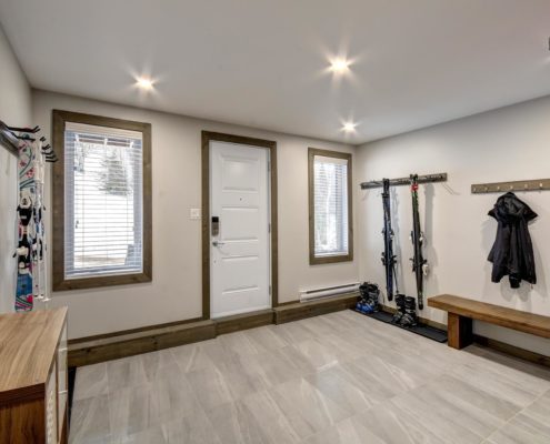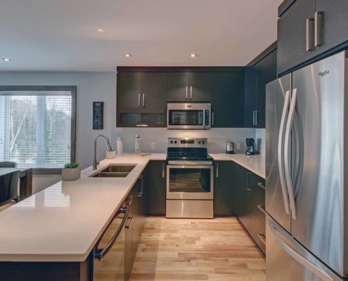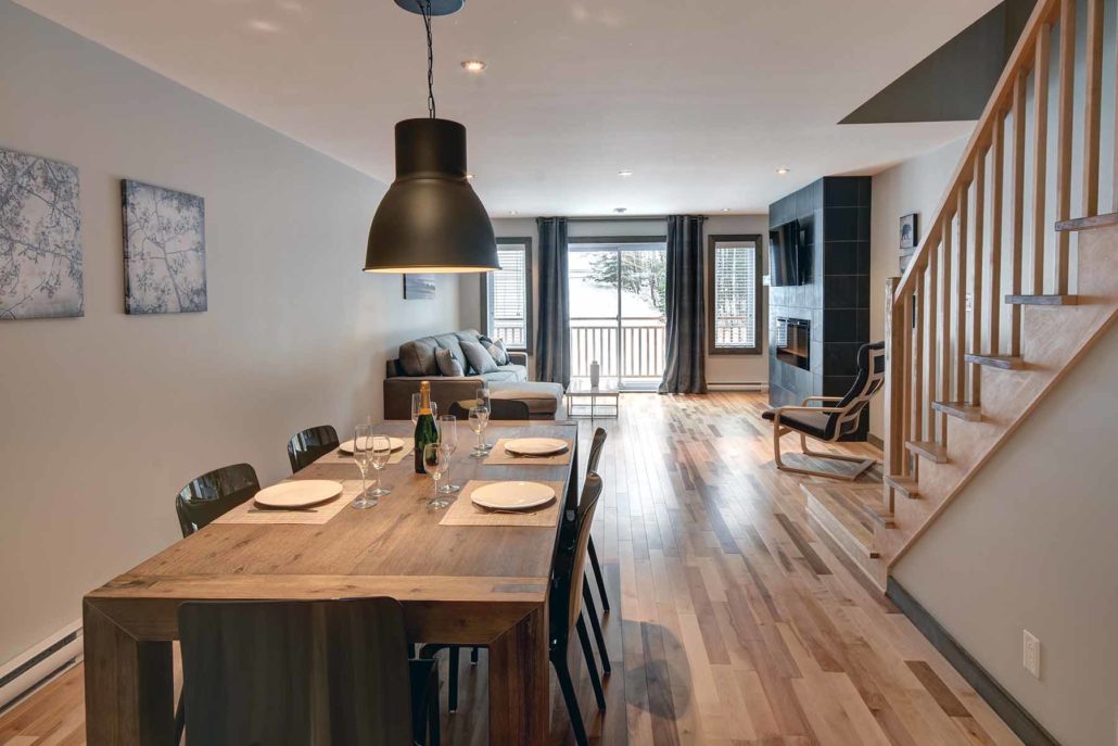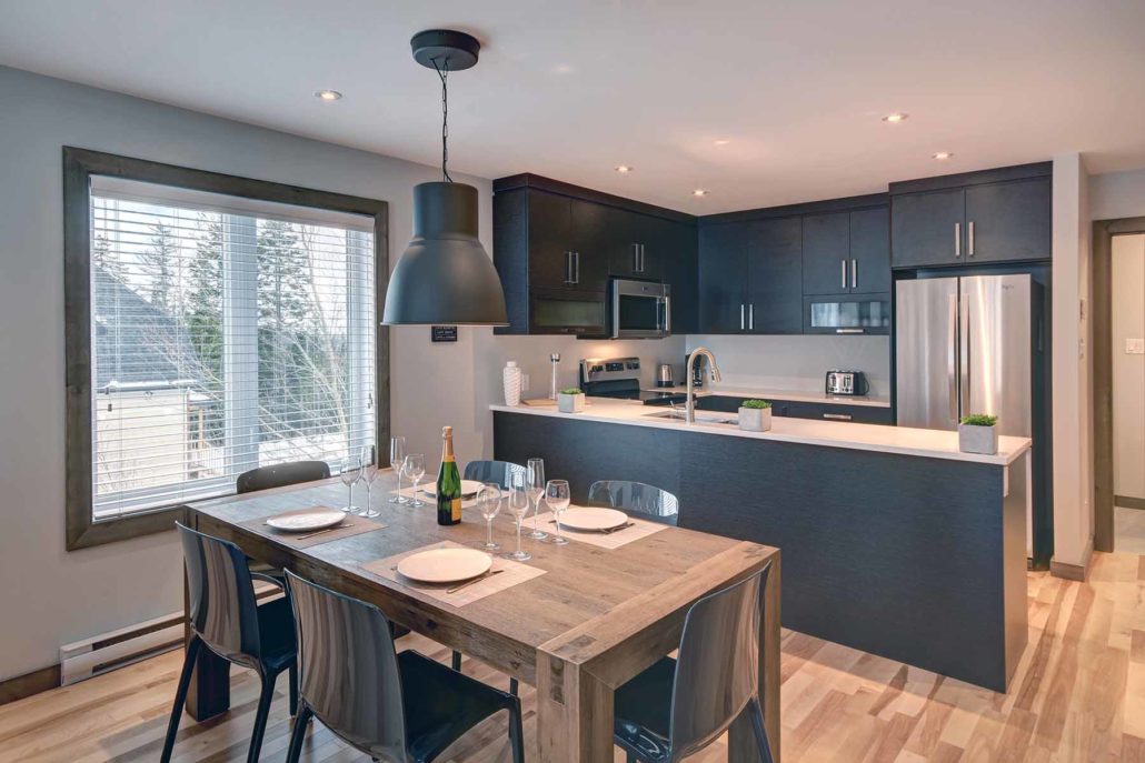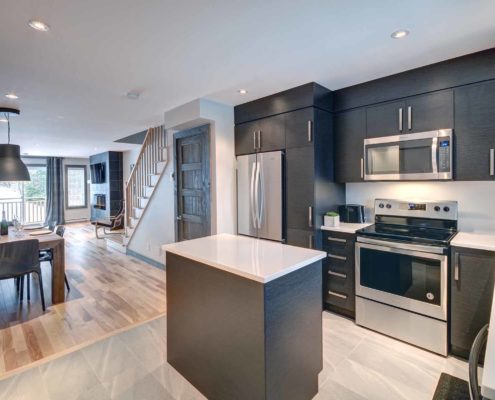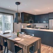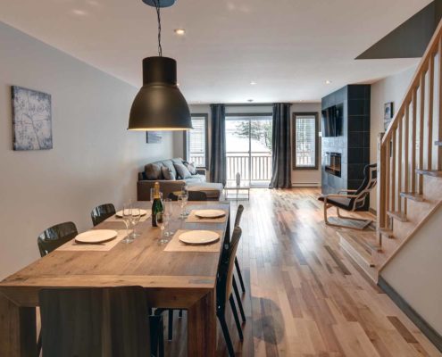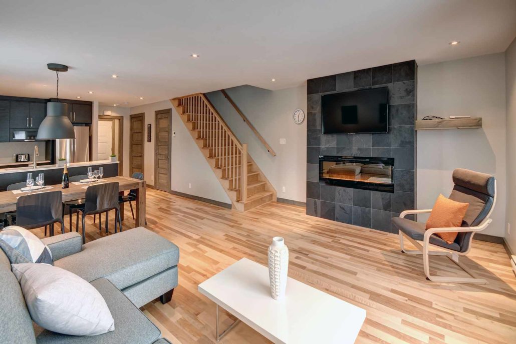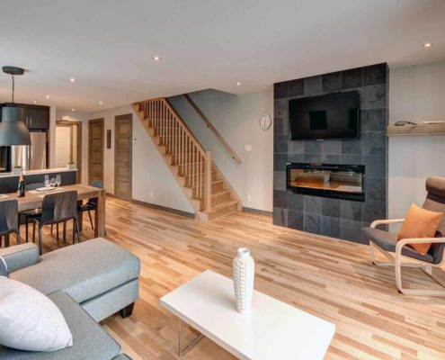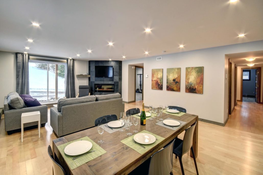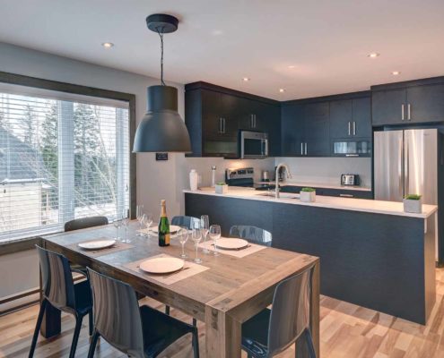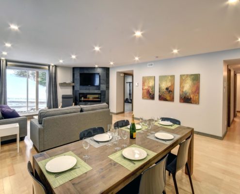 Chaque condo inclut de base les éléments de confort suivants: Espace ouvert cuisine-salon-salle à diner, Cuisine moderne entièrement équipée, Salle à diner assis jusqu’à 8 à 10 personnes, table basse, foyer électrique et TV, 1 salle de bain complète avec bain-douche intégré et/ou 1 salle de bain avec douche ’walk-in’, Chauffage au sol dans les salles de bain, laveuse et sécheuse, Aspirateur central, Locker extérieur privé et sécurisé pour le matériel de ski et Balcon.