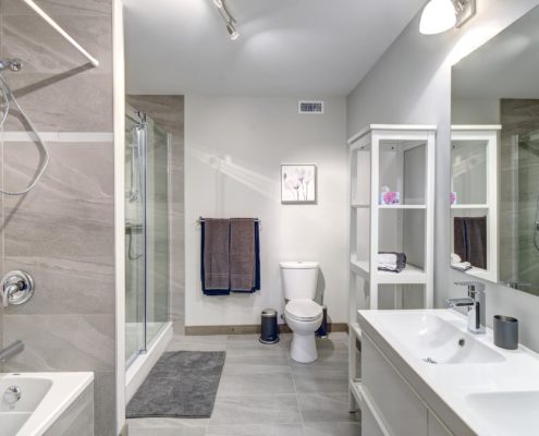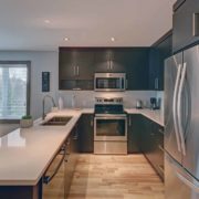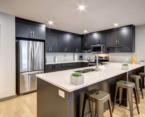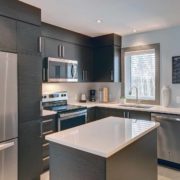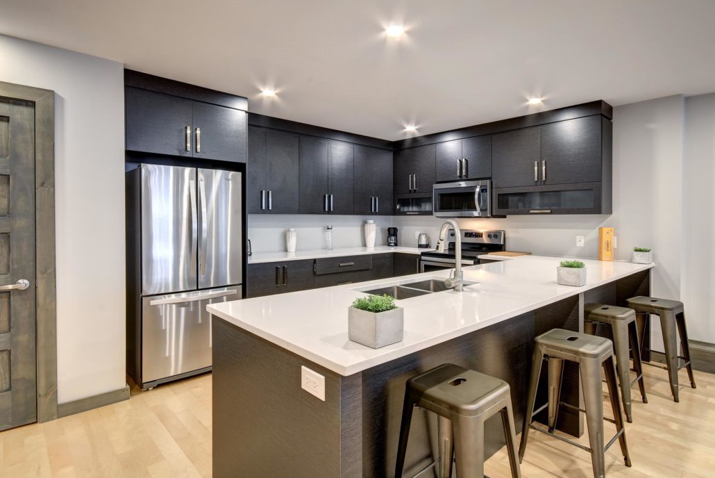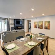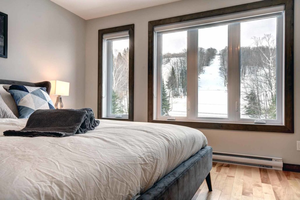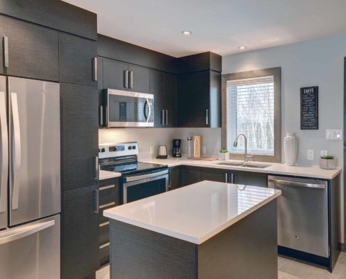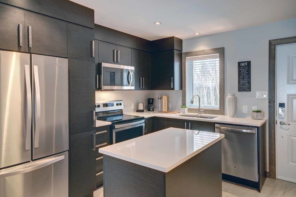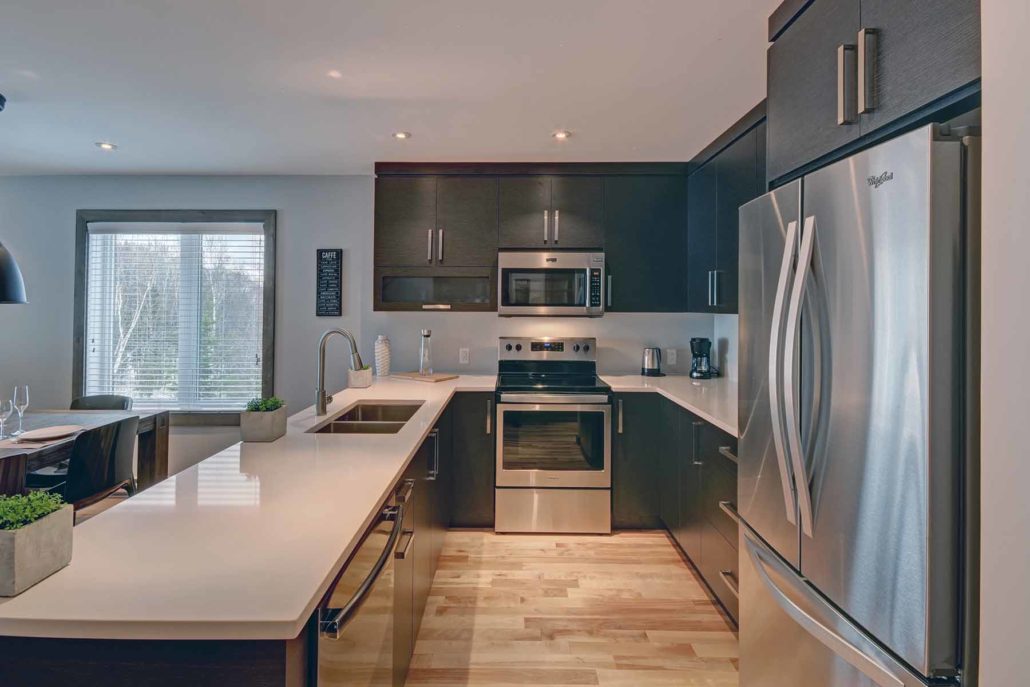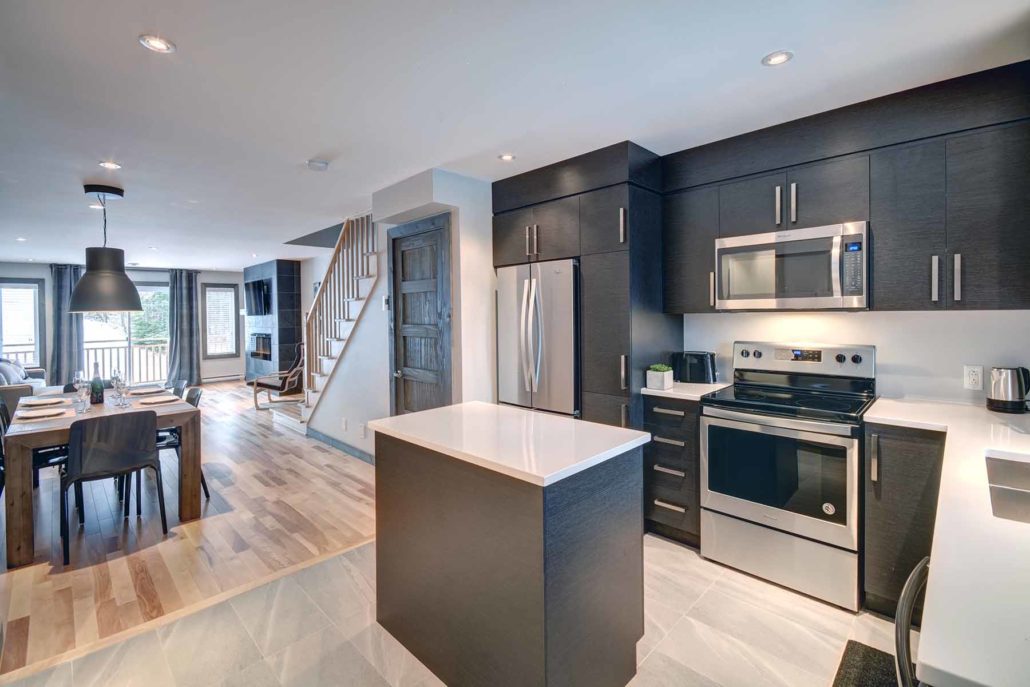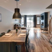 Chaque condo inclut de base les éléments de confort suivants: Espace ouvert cuisine-salon-salle à diner, Cuisine moderne entièrement équipée, Salle à diner assis jusqu’à 8 à 10 personnes, table basse, foyer électrique et TV, 1 salle de bain complète avec bain-douche intégré et/ou 1 salle de bain avec douche ’walk-in’, Chauffage au sol dans les salles de bain, laveuse et sécheuse, Aspirateur central, Locker extérieur privé et sécurisé pour le matériel de ski et Balcon.